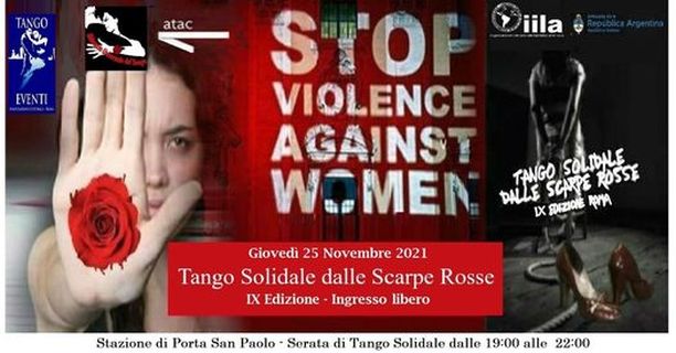 Torna a Roma , giovedì 25 novembre, dalle 19,00 alle 22,00, l'XI edizione del TANGO SOLIDALE DALLE SCARPE ROSSE" , Stazione di Porta S. Paolo, evento ideato e organizzato da Fatima Scialdone, attrice e danzatrice, dir. artistico Ass.Cult TangoEventi , in collaborazione con ATAC, e con il patrocinio dell' Ambasciata Argentina ,I.I.L.A Istituto Italo Latino americano ,con la partecipazione della "Banda Musicale della Polizia Locale di Roma Capitale". 25 novembre Giornata Internazionale per l'eliminazione della violenza contro le donne. Ingresso libero.