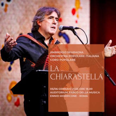 Appuntamento ormai di tradizione per iniziare bene l'anno, torna il 5 e il 6 gennaio 2025, in esclusiva per Natale all’Auditorium, La Chiarastella, un progetto originale di Ambrogio Sparagna, con l’Orchestra Popolare Italiana e il Coro Popolare presso la Sala Sinopoli dell'Auditorium Parco della Musica.