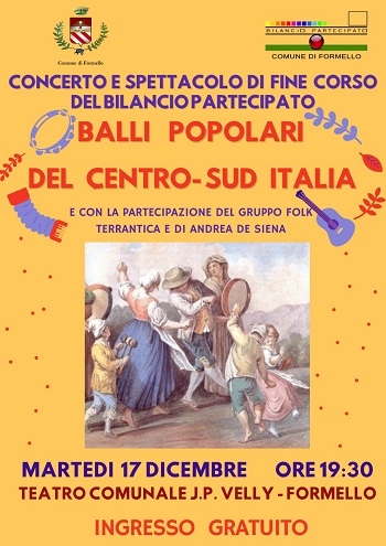 Danze popolari, musiche, canti, ritmi travolgenti; così il gruppo folk Terrantica, Andrea De Siena e i partecipanti al corso di danze tradizionali del centro-sud Italia ('bilancio partecipato') hanno dato vita a uno spettacolo coinvolgente che ha incantato il pubblico del teatro comunale di Formello (Roma).