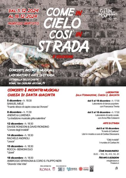 Prende il via giovedì 5 dicembre la seconda edizione del Festival “Come in cielo, così in strada” che ha in programma, concerti, incontri musicali, laboratori di danza e canto, mostre e opere di street art in un contesto unico e speciale: la Cittadella della Carità di Ponte Casilino, gestito dalla Caritas Diocesana di Roma. Un luogo di accoglienza e di promozione sociale che intende proporsi anche come originale punto di riferimento della creatività dell’area sudest della Capitale, soprattutto in vista dell’imminente anno giubilare. Direzione Artistica di Ambrogio Sparagna e di Erasmo Treglia.
