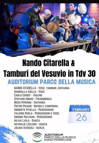 Il 26 febbraio al Parco della Musica di Roma festa di compleanno tra musica e danza per i trenta anni dei Tamburi del Vesuvio , realtà musicale multietnica nata dalla ispirazione del maestro Nando Citarella, che celebra anche i suoi 48 anni di carriera. Sul palco tanti compagni di viaggio, tanti ospiti, tanti amici per celebrare questa Festa tra presente e antico che ci riporta tra le sonorità del mondo seguendo il filo rosso del battito del Tamburo e l'odore del mare.