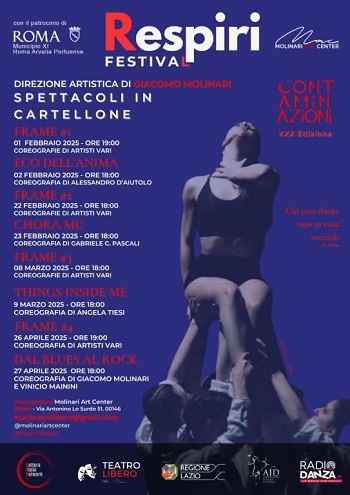 Oltre a proporre interessanti coreografie – nuovissime o rielaborate - il “Respiri Festival” è anche una competizione dedicata a coreografi emergenti e una vetrina per nuove produzioni. Nove in tutto gli appuntamenti coreografici, di cui 4 dedicati al contest coreografico Frames#, in cui i giovani artisti si confrontano per ottenere riconoscimenti e premi, tra i quali una residenza coreografica al Molinari Art Center. Cinque le serate di spettacolo che accompagneranno il pubblico sino a maggio. Tutti gli appuntamenti della rassegna hanno il patrocinio del comune di Roma (Municipio XI) e vedono come media partner ufficiale la radio web RadioDanza e Cultura Italia Network.