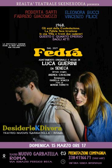 Fedra,  Domenica 15 marzo, ore 17,00,  con Roberta Sarti (Fedra), Fabrizio Giacomozzi (Teseo), Vincenzo Filice (Ippolito), Eleonora Bucci (Nutrice). Adattamento originale e regia di Luca Guerini. Produzione Realtà teatrale Skenexodia