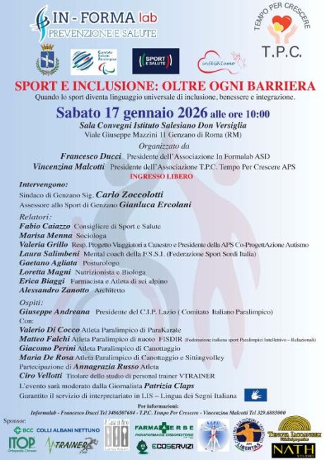 “Sport e inclusione: oltre ogni barriera” in primo piano a Genzano di Roma sabato 17 gennaio alle ore 10 nella sala Convegni dell’Istituto Salesiano Don Versiglia ( viale Giuseppe Mazzini 11). Organizzato dalle associazioni T.P.C. Tempo per Crescere Aps e In–Forma Lab Asd con il patrocinio del Comune di Genzano di Roma, CIP (Comitato Italiano Paralimpico), Sport E Salute e inSEGNIamo Aps , il convegno , aperto al pubblico, porta al centro lo sport ponendo l’accento sull’imprescindibilità dell’inclusione, a tutela del benessere e della salute dei soggetti con difficoltà psicomotorie.