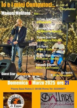 Presso la suggestiva location romana " Le vere grotte Imperiali" serata musicale lo scorso 9 marzo con Manuel Melitoto, uno dei "Frankiani" più accreditati presso i fan del cantautore romano Califano. Presentato lo spettacolo "Io e i miei Cantautori" , un live che si è snodato tra suoi brani inediti mai presentati in pubblico e cover dei cantautori più amati tra i quali è cresciuto.